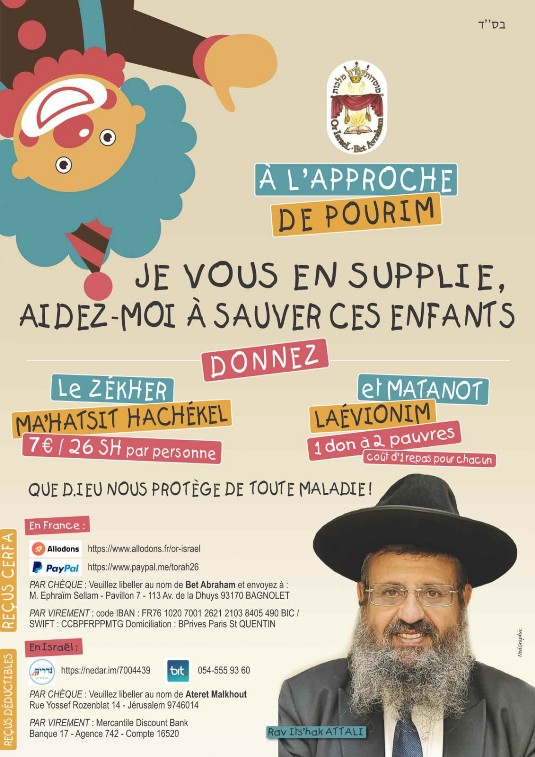 a le devoir (Mitsva) de faire un don à 2 pauvres à l'occasion de Pourim. Ce commandement divin est appelé "Matanot Laevyonim". Cette somme d'argent doit être remise aux nécessiteux le jour-même de la fête.